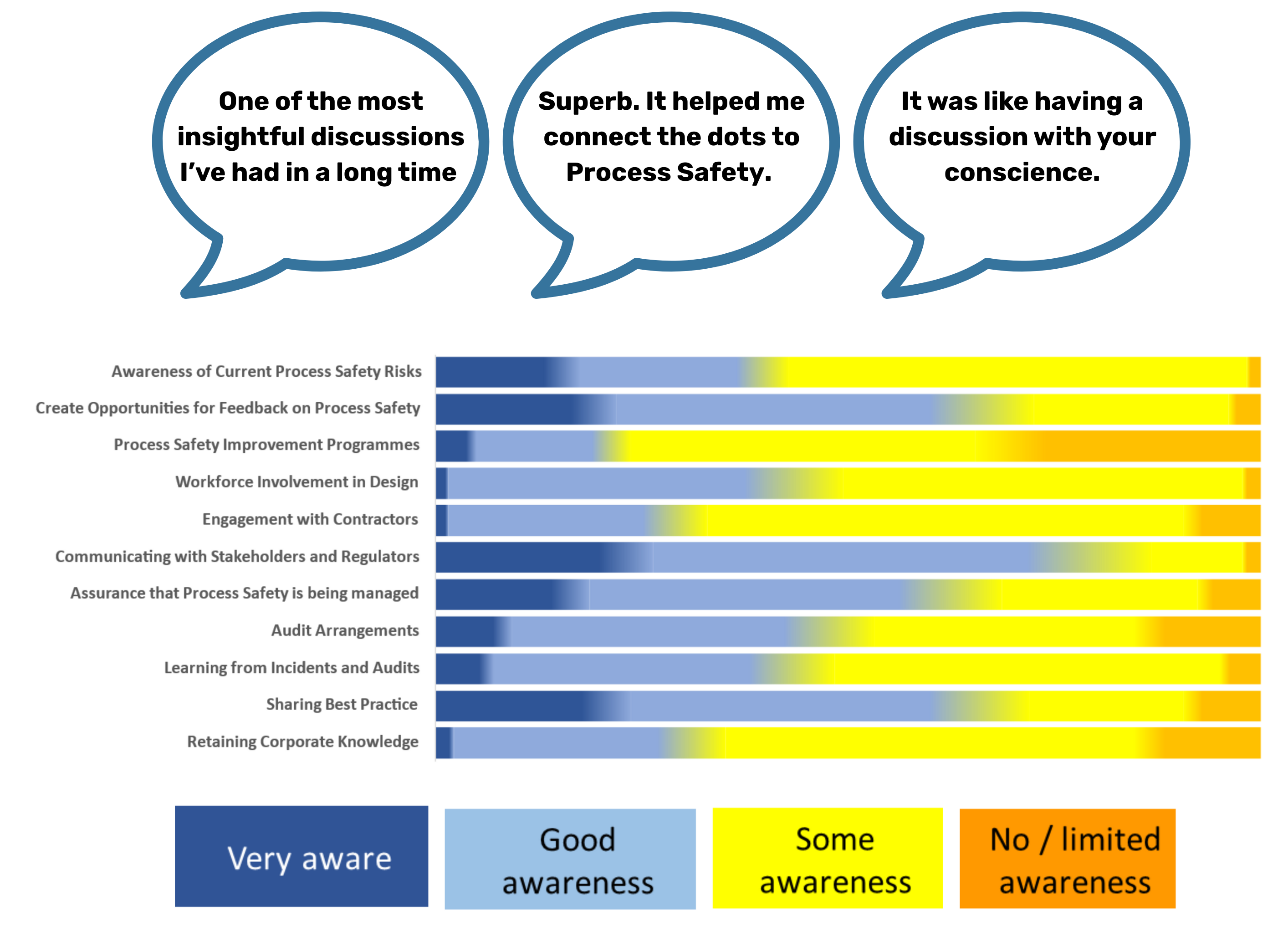 A two-person team (a former regulator and an industry executive) sits down with people across your team from Board level to frontline staff in structured sessions designed to assess leadership, visibility, workforce engagement, contractor management, assurance, performance, and learning. We use 17 targeted questions aligned with the eight Process Safety Leadership principles, leveraging insights from over 200 confidential interviews across more than 20 leadership teams in high-hazard sectors.
